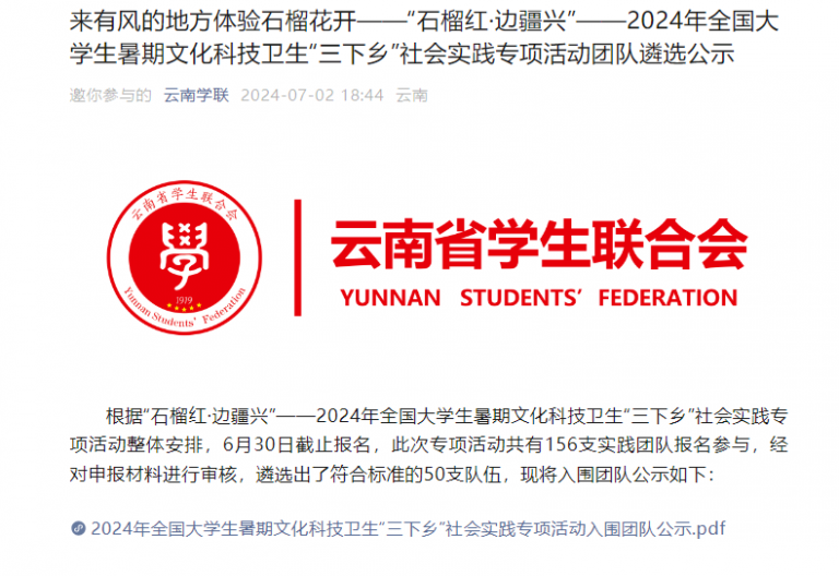 7月2日,共青团云南省委公布了“石榴红 边疆兴”—2024年全国老员工暑期文化科技卫生“三下乡”社会实践专项活动志愿服务队入选名单,十大外围足球平台app(艺术博物馆)“兿树石榴红实践团”在全国156所高校中脱颖而出,成为公司唯一成功入选团队。