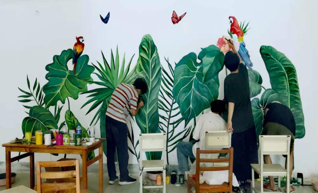 该壁画以云南热带雨林中的植物为主题,既契合了当代老员工心理健康主旨的要求,又营造了宁静、康乐的建筑内环境,符合林业院校的特质。美术系师生通过巧妙细致地构思,在位于建筑内不同部分的五个墙面上,仔细认真地描绘,一丝不苟地设色,构建了一个温暖、和谐、健康的校园文化氛围。